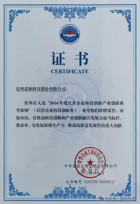 С проектом «Интеллектуальная энергосберегающая система JECO и ее применение» компания Цзяхэ получила награду «Всекитайский типичный пример по инновации в промышленности научно-технических инноваций для частных предприятий», она и стала единственным частным предприятием из провинции Юньнань, которое было зачислено в список типичных примеров.