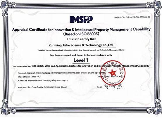 Полученный сертификат является признанием способности компании Цзяхэ в области управления инновациями и интеллектуальной собственностью. Заглядывая в будущее, АО Куньминская научно-техническая компания Цзянхэ воспримет внедрение системы управления инновациями и интеллектуальной собственностью ISO 56005 как важную возможность, чтобы взять в руки меч инноваций, охранять плоды интеллектуальной деятельности. Компания продолжит совершенствовать собственную систему управления, интегрировать интеллектуальную собственность во все процессы хозяйственной деятельности и развития, а также продолжит повышать уровень управления инновациями и интеллектуальной собственностью, постоянно повышать основную конкурентоспособность компании и предоставлять клиентам высококачественные продукты и услуги.